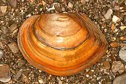 Sinanodonta woodiana, the Chinese pond mussel, is a species of East Asian freshwater unionid bivalve mollusk primarily known from the Amur River, in the Russian Far East, and China's Yangtze River. The Chinese pond mussel can grow to 30 cm and attain an age of 12–14 years, and they can reproduce by the end of their first year, while only 3–4 cm in size.[12]