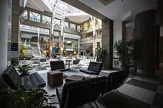 Sinclair Centre is an upscale shopping mall in Downtown Vancouver, British Columbia. It is located at 757 West Hastings Street between Granville and Howe streets. The centre comprises four buildings that were restored and connected by a new atrium space designed by Henriquez Partners Architects and Toby Russell Buckwell Architects in 1986.[1] The cost for this work was 38 million. The main post office was housed here from 1910 until the new one opened in 1958. The Post Office Building is in an Edwardian Baroque style, combining English and French influences. It features an atrium clock consisting of four 12-foot-diameter (3.7 m) clocks built in 1909 and is the largest clock movement in Western Canada; the minute hands alone weigh 92 kilograms (202 pounds) each. In addition to the mall, the building has a seven floor office tower occupied by the federal government.[2] The buildings that comprise the centre are the Post Office (1910 - David Ewart), the handsome and architecturally esteemed[3] Winch Building (1911 - Thomas Hooper), the Customs Examining Warehouse (1913 - David Ewart), and the Federal Building (1937 - Thomas W. Fuller). The mall is home to elite boutiques.[4] The complex was renovated in 1986 and announced on November 13, 1983 that it was renamed after James Sinclair, member of Parliament for Vancouver North and later Coast—Capilano as well as Minister of Fisheries. Sinclair is the maternal grandfather of 23rd Canadian Prime Minister Justin Trudeau.[5]