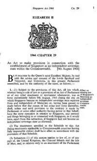 The Singapore Act 1966 (c. 29) was an Act passed by the Parliament of the United Kingdom that admitted Singapore as a sovereign state into the Commonwealth of Nations with retroactive effect from 9 August 1965, being the date on which Singapore became a sovereign state within the Commonwealth.