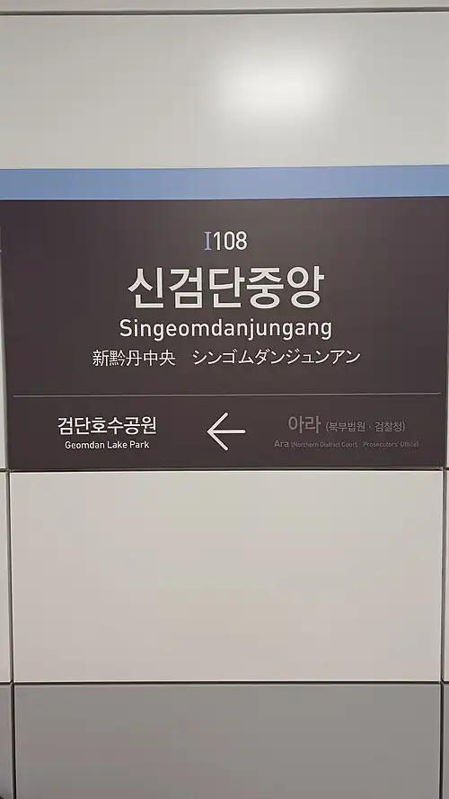 Singeomdanjungang station (Korean: 신검단중앙역) is a Line 1 subway station of the Incheon Subway in Seo-gu, Incheon, South Korea. It opened on June 28, 2025.[1]