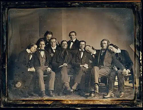 Nevertheless, the Hutchinsons were a hit, the first American close-harmony quartet to see such success.[5] They adopted the name "Tribe of Jesse" after further touring in 1843. Imitators appeared, and the Hutchinsons even toured with one of these, the Luca family, in 1859.[11] Four-part harmony became an important component of all American popular music.[12] Minstrel show troupes compared themselves to the Hutchinsons. In 1844, the Congo Minstrels advertised that "their songs are sung in Harmony in the style of the Hutchinson Family."[13] Other minstrels parodied the group. The Harmoneon Family Singers (later the Boston Harmoneons) wore powdered wigs and faces and called themselves the Albino Minstrels or the Albino Family in what was supposed to be a blackface show.[14]