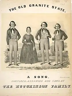 The Hutchinsons performed across New England in 1842, taking in as much as $130 (~$4,236 in 2024) per performance. In 1843, Jesse wrote "The Old Granite State", a song about the Hutchinson family, their origins in New Hampshire, and their itinerant lifestyle. The song became their signature number.[5]