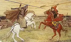 Sometimes however, such single combat would merely initiate a battle rather than prevent it. The most famous example of this was the duel between Russian monk Alexander Peresvet and the Golden Horde champion Chelubey or Temir-Murza at the beginning of the Battle of Kulikovo in 1380. The champions killed each other in the first run, though according to Russian legend, Peresvet did not fall from the saddle, while Temir-Murza did.