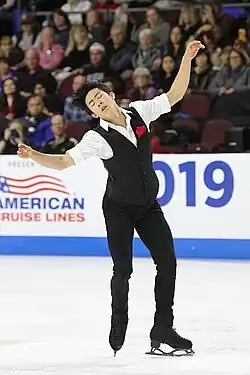 There are three basic positions in spins: the camel, the sit spin, and the upright spin.[4] There are two types of spins, the forward spin and the backward spin.[46] Skaters also perform flying spins, which are the combination of a jump and a spin, as well as spin combinations.[47][48] A spin consists of the following parts: preparation, entry, spin, and exit.[49] Single skaters earn more points for performing difficult entrances into and exits out of their spins.[50]