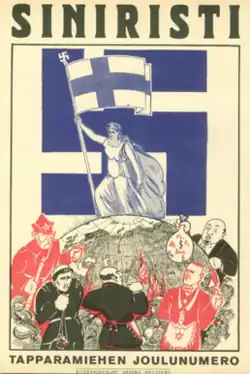 Siniristi was a deeply antisemitic magazine, and its antisemitism was mainly based on Christian antisemitism, which was the dominant current in Finnish society.[2] Tahvo Liljeblad published many articles on the relations of Christians and Jews: to him Jesus was the most powerful opponent of the Jews and was killed for challenging the teachings of the rabbis "which are fatal to humanity". As punishment the Jews were cursed and scattered by God.[1] In 1933 Siniristi published an exposé on the Talmud which supposedly contained attacks on Christianity, because the Jews understood Christianity stood against their world-conquest plans.[1][3]