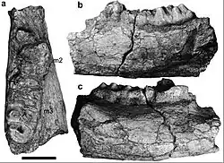 It was known from the holotype, specimen GIOTC 0984-9-178, which was a single fragmentary mandible found in the 1990s, however, most of the specimen has been lost, leaving only the right ramus and an in-situ photograph of the mandible. The surviving ramus, known as the "Yanghecun specimen", was collected in 1999 in the Neogene-aged Xihe Linxian Basin in Miocene-aged deposits by Zhao Desi.[2] The left branch of the jaw was lost during the salvage and is only documented by a photo of the fossil in situ.[1]