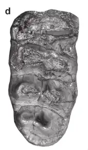 The lower jaw as a whole was relatively robust, the horizontal bone body had a rounded cross-section, to the rear it widened significantly. The symphysis was narrow and long, alveoli for the mandibular tusks were not formed. In the lower jaw are still the second and the third molar. The second is completely chewed off and does not reveal any diagnostic features, but it originally consisted of three transverse groins (trilophodont). The third grinding tooth was already fully formed. It had a length of 16.7 cm and a width of 8.25 cm.[1] On the chewing surface there were four groins. In the outline, it showed a square shape, narrowing backwards, so that the tooth on the fourth groin reached only 6.35 cm wide. Due to the dimensions, the teeth in Sinomammut were rather wide and not as narrow as in the representatives of the Gomphotheriidae as opposed to other mammutids.[1] The chewing surface had the zygodont structure typical of mammutids. Each bar was divided into two half-strips, each consisting of a main hump at the edges of the teeth. This was followed by a smaller hump on the inside of the tooth, both humps were firmly connected to each other by a enamel strip, so that a continuous sharp edge was created. Behind the last groin of the third molar was a small cingulum, a protruding bead of tooth enamel, which at Sinomammut consisted of six small humps. The cingulum continued weakly developed along the inner and outer longitudinal side of the tooth.[2][1][3]