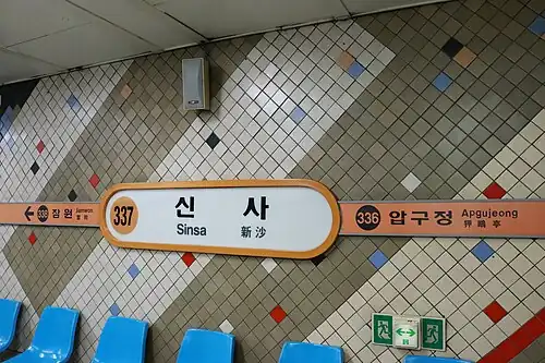 ![]() The station nameplate of Sinsa station in 2017 | ||||||||||||||||