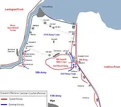 The formulated operation required three army corps to penetrate the Soviet defenses south of Leningrad. One corps would then cut off Leningrad from the troops to the south and west, while the other two would turn east and destroy the Soviet forces between the Neva River and Lake Ladoga. Then the three corps could capture Leningrad without heavy street fighting.[13]