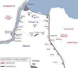 Neither side was aware that the other was building up forces and planning to launch an offensive in the region. The Germans only realized that the Soviet action was a major offensive in the following days after the start of the attack by the 8th Army on 27 August. This resulted in the 11th Army and the 8th Air Corps being reassigned to deal with a major Soviet offensive and abandon preparations for the offensive on Leningrad.[21] Likewise the Soviet forces were unaware of the redeployment of the 11th Army to Leningrad and only expected to face ten divisions of the 18th Army. The redeployment of forces from the Crimea was not detected. This meant that the Soviet forces were launching an offensive when at a numerical disadvantage even before the battle started.[8]