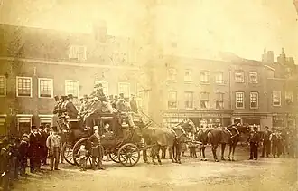 Somerset was the owner of l'Hirondelle, a French-made four-in-hand coach with seating for more than 20 passengers. He set up a regular service for the Hirondelle, driving it from Enfield to Luton and Hitchin and back in the late 1870s with his chestnut horses. The coach left The George coaching inn in Enfield at 10:45 am and arrived at Hitchin's The Sun at 1:30 pm.[10]