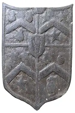 The ledger stone of Sir Amyas Pollard (1616–1701), 3rd Baronet, survives before the altar in Abbots Bickington Church, Devon, inscribed as follows: "To the memory of Sr. Ames Pollard, Barron(e)t, who departed this life June the 5th 1701 and was here interr'd the 7th of the same in ye 85th year of his age". Below is an heraldic achievement of Pollard showing an escutcheon of the Pollard arms: Quarterly 1st & 4th, a chevron between three escallops; 2nd & 3rd: a chevron between three mullets; overall the Red Hand of Ulster. Above the escutcheon is the crest of Pollard: A leopard's head and neck erased. Beneath is the following verse:
