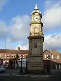 1884 | Erected by Picton as a memorial to his wife. It now stands surrounded by a roundabout. The tower is in three stages with a clock face in each of its four sides. At the top is a lead cupola with a short spire. Around the base are four iron lamp posts.[27][28] | II |