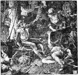 At Flores Island the English fleet was surprised by a much larger squadron sent by King Philip II of Spain. Howard retreated to safety, but Grenville faced the 53 enemy ships alone, leading his single ship in what amounted to a suicide mission, stating that he "utterly refused to turn from the enimie...he would rather chose to die than to dishonour himselfe".[15] His crew was reduced by nearly 100 men due to sickness on shore, but he chose nonetheless to confront the far superior Spanish force.[15] For twelve hours he and his crew fought off the Spanish, causing heavy damage to fifteen galleons. According to Raleigh's account, Grenville and his soldiers fought for hour after hour, "...until all the powder of The Revenge, to the last barrell, was now spent, all her pikes broken, fortie of her best men slain, and the most part of the rest hurt".[15] The ship itself was "marvellous unsaverie, filled with bloud and bodies of deade and wounded men like a slaughter house".[15]