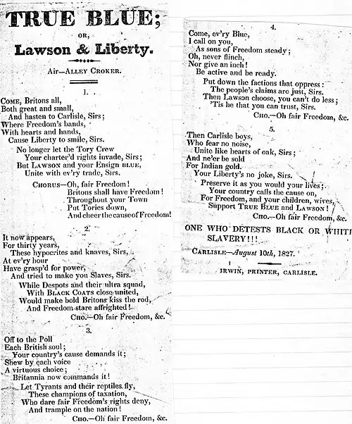 After the death of Sir Philip Musgrave in 1827, Lawson reluctantly[5] came forward as the Parliamentary Whig (Blue) candidate for the representation of the City of Carlisle, in opposition to James Law Lushington, the Tory (Yellows) Lowther nominee. Lawson stood on the following manifesto: