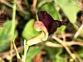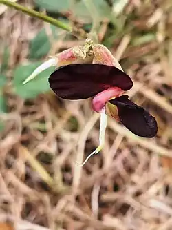 M. atropurpureum is a tropical herbaceous dicot belonging to the family Fabaceae. It rapidly develops dense, hairy, dark green vines about 5 mm in diameter,[5] until it reaches its mature size around 120 cm.[3] The vines have bright green trifoliolate leaves, which are roughly 2–7 cm long with smooth hairs on the underside.[6] Flowers are dark reddish purple. The seeds are small brown peas with a white spot, found in the plant's pods which hang on the vines in bunches of about 5-10.[5] In weather and soil conditions favourable to the plant, stem nodes close to the soil may root, enabling vegetative propagation of the plant.[3] M. atropurpureum forms a deep swollen taproot up to 2 cm in diameter.[7]
