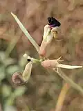 Inflorescence showing one flower with petals and two flowers without petals and young pod