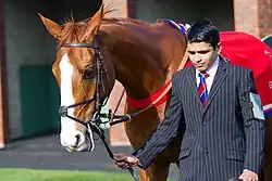 Sire De Grugy was a chestnut horse with a broad white blaze bred by La Grugerie stud at Pouancé, Maine-et-Loire in France.[1] He was sired by the Thoroughbred stallion My Risk who won seven races including the Prix Quincey, Prix Perth, Prix Edmond Blanc and Prix du Chemin de Fer du Nord. Apart from Sire De Grugy, the best of his progeny has been the flat racer No Risk At All who won La Coupe and the Grand Prix de Vichy-Auvergne.[2] Sire De Grugy's dam Hirlish, was not a Thoroughbred, being descended from La Camargo, a mare of unknown parentage, whose descendants have been classified as AQPS or Selle Français.
