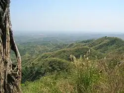 Sitakunda Upazila occupies an area of 483.97 square kilometres (186.86 sq mi),[34] which includes 61.61 square kilometres (23.79 sq mi) of forest.[35] It is bordered by Mirsharai to the north, Pahartali to the south, Fatickchhari, Hathazari and Panchlaish to the east, and the Sandwip Channel in the Bay of Bengal to the west.[36] The Sitakunda range is a 32-kilometre (20 mi) long ridge in the center of the upazila, which reaches an altitude of 352 metres (1,155 ft) above sea level at Chandranath or Sitakunda peak, the highest peak in Chittagong District.[19][37] Part of Sitakunda is covered by the low hill ranges, while the rest is in the Bengal flood plain.[37] To the north, Rajbari Tila at 274 metres (899 ft) and Sajidhala at 244 metres (801 ft) are the highest peaks in this range, which drops abruptly to a height of less than 92 metres (302 ft) in the vicinity of Chittagong City to the south.[37] About 5 kilometres (3 mi) north of Sitakunda Town is the Labanakhya saltwater hot spring, which has been proposed as a source of geothermal energy.[38][39] There are two waterfalls in the hills: Sahasradhara (thousand streams) and Suptadhara (hidden stream).[40] Both have been identified as sites requiring special attention for protection and preservation by the National Heritage Foundation of Bangladesh.[41]