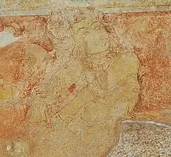 Though severely damaged due to vandalism, remaining Frescoes have been preserved on the top parts of columns and ceilings inside the temple. Many of them are typical of the 9th century Pandyan period and include detailed pictures of elephants, buffaloes, fish, geese, Jains gathering lotuses from a pond and dancing girls.[19] These frescoes are considered to be some of the best frescoes of medieval India next to frescoes of Ajanta Caves and Bagh Caves.[3][4][10] Not so well planned is the arrangement of panels of the Sittanvassal cave temple; the idea of an ensemble has not been adopted but arranged in a haphazard way.[20]