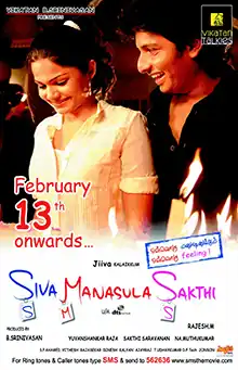 Siva Manasula Sakthi (transl. Sakthi in Siva's heart) also known by the initialism SMS, is a 2009 Indian Tamil-language romantic comedy film written and directed by debutant M. Rajesh. It stars Jiiva and newcomer Anuya Bhagwat in the lead roles, with Santhanam, Urvashi and Sathyan appearing in supporting and Arya appearing in a cameo role.