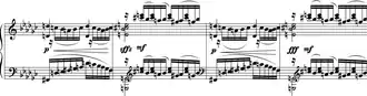Like the second and fourth pieces, number six is written in the form of an étude, with a repetitive but technically challenging chordal melody that is doubled in both hands.[2] In all, the work has three distinct elements played simultaneously: the main melody, the continuous thirty-second note broken chord figures, and a descending eighth note motif.[14] Dynamics play a large part in this piece: the fortissimo marked at the beginning is maintained all throughout the first section, with only brief respites to mezzo forte.[14] The middle section is wholly softer, and contains two areas with significant mounting tension, creating the aforementioned "apotheosis effect" with dramatic "false starts."[9] Here, the theme is manipulated contrapuntally to develop a canonic effect. This "triple counterpoint... is titanic both in size and impact, and in potential for disaster,"[9] referring to the tension, waiting for the final climax, in this "continuing explosion."[1] Immediately before the coda, the thick texture and canon suddenly disappear and the piece becomes piano. Upon entering the coda, the work resumes the forte theme and amalgamates to a majestic ending played fortississimo.[14]