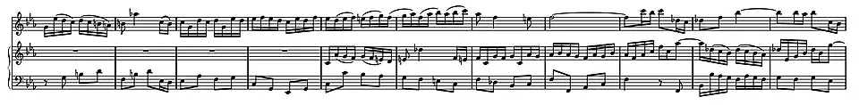 For the remainder of the ritornello the semiquavers pass to the bass, with an arpeggiated version of the motifs for two bars which leads into a short coda and a cadence marking the beginning of the middle section of the movement. The arpeggios in the left hand of the harpischord are accompanied by an adaptation of the syncopated countersubject in the right hand and fragmented quaver responses in the violin.