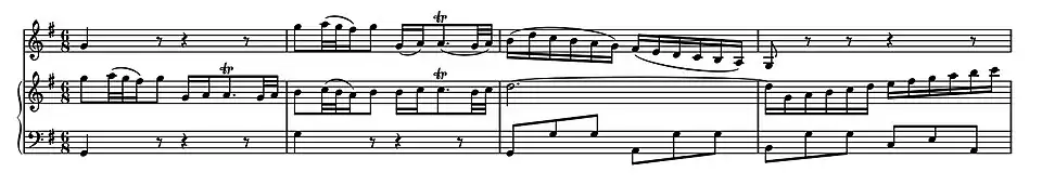 time is a Siciliano, a binary dance-form widely used in the early eighteenth century. In the minor key it was associated with a mood of melancholy or even pathos. The elegiac melodic line and ornamentation are entirely suited to the violin. As numerous commentators have pointed out, with its affecting anapaests, the compositional style and impassioned tone resemble those of the obbligato violin solo in the celebrated alto aria "Erbarme dich" from Bach's St Matthew Passion. The harpsichord supplies a continuo-like accompaniment. There are arpeggiated semiquaver figures in the harpsichord right hand, while the quavers in the left hand—with their French tenue slurs gradually descending in steps—provide a rhythmic pulse gently driving the movement forward, almost like an ostinato bass.[9]