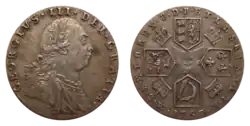 With the exception of a handful of early examples, Charles II sixpences continued to be machine-struck, and continued the usual practice of having a portrait of the monarch on the obverse. The reverse features a new design consisting of four shields arranged in a cross, with the inscription detailing the style of the monarch split across both sides of the coin. With minor changes, such as the device at the centre of the shields, and the designs between the shields, this basic design continued to be minted through the reign of George III.[22]
