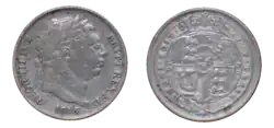 Those coins minted after the great recoinage of 1816 bear the royal coat of arms on the reverse, surrounded by the Garter, which bears the words HONI SOIT QUI MAL Y PENSE, Middle French for "Shame on him who thinks ill of it".[23] George IV sixpences are similar to those of his predecessor, but on some issues the Garter surrounding the shield is replaced by floral emblems representing England, Scotland and Ireland, with the inscription ANNO followed by the year of minting below.[24]