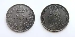 William IV sixpences have a simpler reverse, composed of the words SIX PENCE in the middle, with a crown above, the date below, and a wreath surrounding. With the exception of a withdrawn 1887 issue, Victoria and Edward VII sixpences share this reverse.[24] The reverse of the 1887 issue is broadly the same as the post-1816 George III coins. This reverse is shared with the half-sovereign, and since the two are of a similar size, a problem arose with people passing off sixpences as half-sovereigns. The government agreed to remove the coin from circulation in November 1887 and change the reverse.[25]