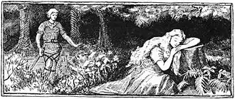 This story is introduced as an explanation for why "Sif's hair" is a kenning for "gold". Loki cuts off Sif's prized blonde hair "for mischief's sake". (The Lokasenna ("Loki's quarrel"), of the Poetic Edda, has Loki seemingly accuse Sif of having an affair with him, perhaps explaining how Loki was able to cut the hair in the first place, although it is unclear if Snorri was referencing this.[14]) Thor, Sif's husband, is enraged by the prank, and demands Loki make it right—or else he'll break every bone in Loki's body. Loki travels to the dwarves, and the sons of Ivaldi agree to create replacement hair made from gold, except it would magically attach to Sif's flesh and grow like normal hair. The sons of Ivaldi also create the portable ship Skídbladnir and the spear Gungnir. Loki raises the stakes by approaching the dwarf Brokkr and his brother Eitri (Sindri) and wagering his head that they cannot create three artifacts that exceed the first three. The three create the shining golden boar Gullinbursti, the replicating ring Draupnir, and the war hammer Mjölnir. As the two dwarves work, a fly stings them and mildly distracts them; the fly is presumably a transformed Loki trying to ensure he wins his bet.[15]