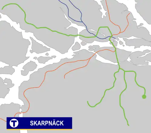 Skarpnäck is a Stockholm metro station located in the Skarpnäcksfältet subdistrict of Skarpnäcks Gård district, Skarpnäck borough.