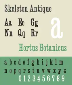 Skeleton Antique is a slab serif wooden letterpress typeface designed by William Hamilton Page[1] and first shown in his company's 1865 catalog. The face is nearly monoline in its stroke width and lacks the over-ornamentation typical of both Page's faces and of other nineteenth century letterpress types.