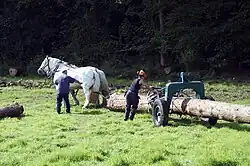 The use of draft horses is much sought-after by owners of wooded parkland, as without the presence of roads allowing access to forests for forestry machinery, the horse can also work in protected areas or areas with fragile soils and plant species (nature parks, Natura 2000 areas, peat bogs, marshy areas, etc.).[4]