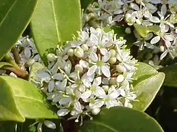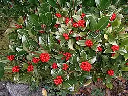 Skimmia is a genus of four species of evergreen dioecious shrubs and small trees in the rue family Rutaceae, all native to warm temperate regions of Asia. The leaves are clustered at the ends of the shoots, simple, lanceolate, 6–21 cm long and 2–5 cm broad, with a smooth margin. The flowers are in dense panicle clusters, each flower small, 6–15 mm diameter, with 4-7 petals. The fruit is red to black, 6–12 mm diameter, a fleshy drupe containing a single seed. All parts of the plant have a pungent aroma when crushed.[1] The botanical name Skimmia is a Latinization of shikimi (シキミ, 樒), which is the Japanese name for Illicium religiosum as well as an element in miyama shikimi (ミヤマシキミ, 深山樒), the Japanese name for Skimmia japonica.