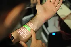 Skinput is an input technology that uses bio-acoustic sensing to localize finger taps on the skin. When augmented with a pico-projector, the device can provide a direct manipulation, graphical user interface on the body. The technology was developed by Chris Harrison, Desney Tan and Dan Morris, at Microsoft Research's Computational User Experiences Group.[1] Skinput represents one way to decouple input from electronic devices with the aim of allowing devices to become smaller without simultaneously shrinking the surface area on which input can be performed. While other systems, like SixthSense have attempted this with computer vision, Skinput employs acoustics, which take advantage of the human body's natural sound conductive properties (e.g., bone conduction).[2] This allows the body to be annexed as an input surface without the need for the skin to be invasively instrumented with sensors, tracking markers, or other items.