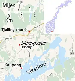 Saga sources such as the 13th-century Fagrskinna place Skiringssal in the region of Vestfold,[10] in Viken, a historical area around Oslofjord,[11] and documents from the 15th century indicate that Skiringssal was then a district which included Tjølling, a settlement a little over 3 miles (5 km) east of Larvik. In 1419 a farm at Guri, about 1 mile (1.6 km) south-west of Tjølling, was said to be in Skirix saal, and in 1445 properties belonging to a hospital in Tønsberg were listed under the heading "Skirissal": those properties which can be identified lay in Tjølling parish.[12] Since Old Norse salr means "hall", the name of this district was presumably understood as the "district ... under the influence of [Skíringssalr]",[2] the hall in question belonging to a king or chieftain.[2] While it is likely that the original name of the local ecclesiastical parish was Tjølling, by the 15th century Skíringssalr had become the name of the bygd, or settlement district, and these names could have been used synonymously.[2]