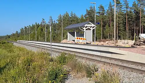 Freight traffic at the station ceased in 1964 and the station turned from a seisakevaihde (an unstaffed station for both passenger and freight traffic in the old classification of railway stations in Finland used until 1969[5]) into a halt. The original station building has been demolished and nowadays there is only a small shelter on the platform.[4]