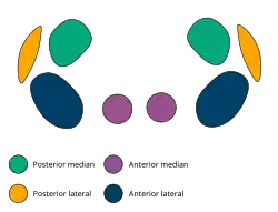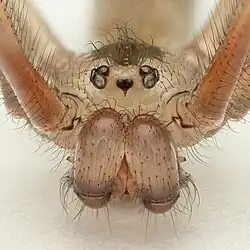 Although some other members of the family Pholcidae have six eyes, Pholcus phalangioides is an eight-eyed spider.[14] The eyes are arranged such that there is a pair of smaller, dark eyes at the front of the prosoma followed by three parallel rows of pairs of larger eyes.[3]