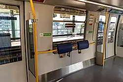 The Hyundai Rotem cars are 3 metres (9.8 ft) in width[49][50] and 20 metres (66 ft) in length,[49][50] both wider and longer than the Bombardier Mark I, Mark II and Mark III cars. Each two-car train has seating for 88 and a normal capacity of 334 passengers at four passengers per square metre (0.37/sq ft), with crush load capacity of 400.[51] A two-car Hyundai Rotem train has more capacity than a four-car Mark I train. The trains feature large, dedicated spaces for wheelchair users, bicycles, and strollers, and sufficient space between seats for luggage. The trains also have large LED displays on both ends of the exterior and interior of the train, displaying the terminus station on exterior signs, with interior displays showing next station, terminus station, and system announcement information.