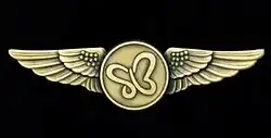 Uniform wings of Skybus Flight Attendants with the butterfly/SB logo.