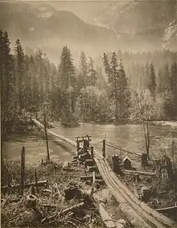 The Skykomish River's main stem is 29 miles (47 km) long, from the confluence of its North and South fork, until it and the Snoqualmie forms the Snohomish River. Adding the longest headwater tributaries, South Fork Skykomish and Tye River, the length is 62.4 miles (100 km).[2] The Skykomish's drainage basin is 834 square miles (2,160 km2) in area.[3] U.S. Highway 2 and the BNSF Railway are routed to follow the Skykomish River, South Fork Skykomish, and Tye River to Stevens Pass and the Cascade Tunnel.
