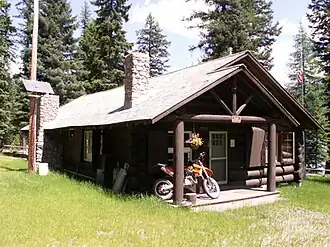 The Skyland Camp-Bowman Lake Ranger Station in Glacier National Park was originally built as the Culver Boys' Military Academy. The main building, known variously as the Skyland Camp Messhall, Culver Boys' Military Academy Messhall and Skyline Chalet, was built in 1920 and is a good example of National Park Service Rustic architecture.[2] The main cabin, known as "Rainbow Lodge" was built by the boys of the academy in 1920 from red cedar logs, and is more elaborate and carefully detailed than typical ranger stations of this period. The interior is dominated by a stone fireplace.[3]