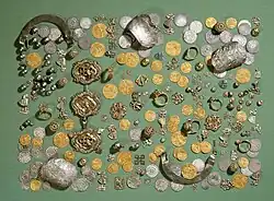 The hoard consisted of 186 European gold coins (total weight: c. 700 g (25 oz)), 269 European silver coins, four silver bars as well as jewellery (mainly finger rings), buckles and decorative garment components.[3] The youngest coins date from 1372.[1]