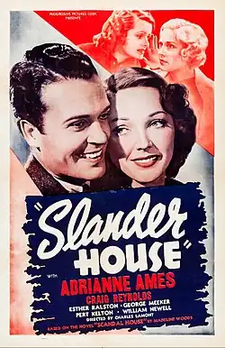 Slander House is a 1938 American drama film directed by Charles Lamont. The film's producer was Ben Judell of Progressive Pictures, known for low-budget exploitation films with provocative titles; other films released by Progressive the same year included Rebellious Daughters and Delinquent Parents.[1][2]