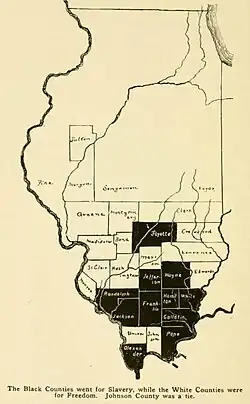 The majority of Illinois voters in 1824 rejected a proposal for a new constitutional convention that could have made slavery legal outright.[1] A map of Illinois free and slave counties in 1824 showing shaded counties that were favorable to legalizing slavery in Illinois.