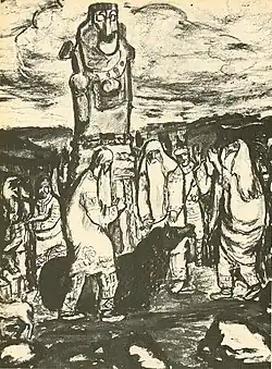 The text mentions the deities Svarog, Yarilo and Veles. It is known that the idol of Veles stood in Kiev "under the mountain", probably on the Kiev Podol, in the lower part of the city, that is, in the trade and craft part of Kiev at the pier on the Pochain River. In the "Life of Vladimir" it is said that this idol was overthrown during the baptism of Kievan Rus in 988: "And Veles idol ... ordered to throw off the river in Pochaina".[9]