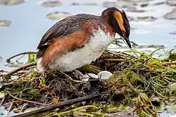 Horned grebes usually arrive at breeding grounds in pairs or solitarily to seek out a mate in the spring or early summer.[2] A pair may nest entirely alone or in a loose colony that typically contains approximately 20 breeding pairs, each pair nesting some distance from the others.[6] During nesting, horned grebes are known to defend their nests very aggressively.[20][2] Nests are built from plant matter and are most commonly affixed to emergent vegetation otherwise built on land or in shallow open water.[21] Depending on location the eggs are laid between April and September, with June being the most common month.[2] The females lays a single clutch of three to eight eggs,[21] which are coloured white, brownish or blueish green.[6][17] These eggs measure 58 by 39 millimetres (2.3 by 1.5 in) on average.[22] Both males and females share incubation time for 22 to 25 days.[2][21] When the young hatch, they can swim and dive within the first few days, although they must be kept warm by their parents for up to 14 days.[6] During this time, the juvenile chicks can often be seen riding on the backs of their swimming parents right in-between the wing and the back.[17] Later the horned grebe will take their first flight at 55–60 days old.[23] The species finally reaches sexual maturity at two years old.[2]