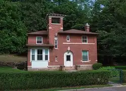 Opposite the carriage barn is another building, also of brick but with a low hip roof. It is one story high, one bay deep and five bays wide. There are three sets of overhead doors on the main (south) facade of the building. A high brick wall encloses the entire complex, and sections of the corner utility structures are a part of the surrounding wall. There is a small building in the northeast corner of the complex; it is one bay square with a steep hip roof with spring eaves. It has single round windows near the root line, on two facades. The building's entrance, on the south facade, is made of wood. The building has a counterpart across the yard, with a low hip roof, a large brick chimney, and a stone water table and string course; it has overhead doors on the north facade.[5]
